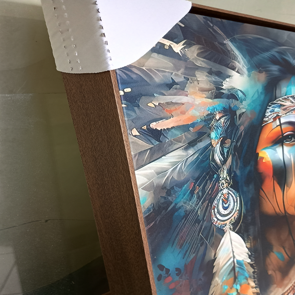 Impressão de alta resolução em tecido 100% algodão com moldura na cor amadeirada.